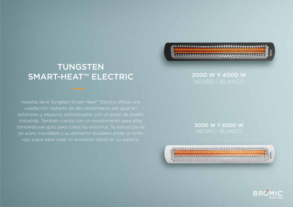 Con su cuerpo prolongado y su reflector de calor, la gama Tungsten Smart-Heat Electric proporciona una amplia pared de calidez en una amplia superficie. Disponible en 4 modelos con potencias caloríficas de hasta 6 kW, estas unidades emiten el mínimo de luz y presentan una solución escalable para quienes desean crear un sistema de calefacción personalizado.