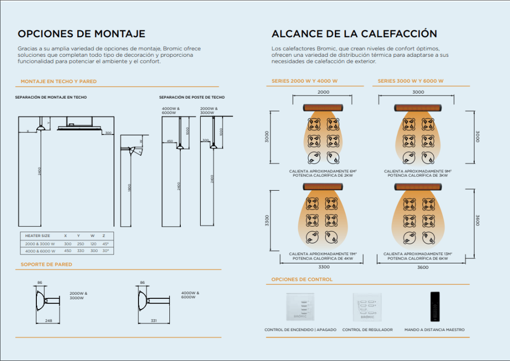 Disponible en modelos de 2000 W (2 kW), 3000 W (3 kW), 4000 W (4 kW) y 6000 W (6 kW), con la posibilidad de ajustar la potencia de los elementos individuales