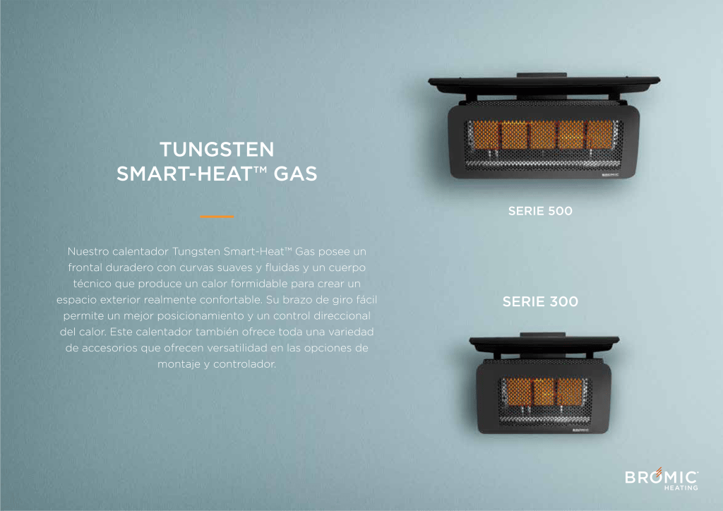 Disponible en dos medidas, la serie Tungsten Smart-Heat Gas incorpora controles electrónicos plenamente funcionales que permiten el manejo a distancia. Su tecnología patentada de pantalla y sonda de ionización garantiza una notable resistencia al viento; con nuestro brazo Easy Pivot, ofrecen aún más posibilidades de posicionamiento, versatilidad y cobertura calorífica.