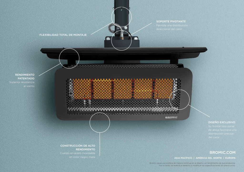 Potente potencia calorífica radiante con un soporte de brazo pivotante de fácil manejo para una mayor versatilidad de posicionamiento